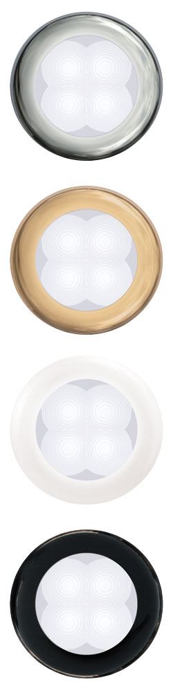 The new LED lamps are available in 9 exciting colours and feature a mounting depth of only 13.0mm. Rims are available in polished 316 stainless steel, gold plated stainless steel, black or white plastic. Custom coloured plastic rims and surface mounting spacer rings are also available. LED lamps consume a fraction of the energy of traditional bulb lamps and run very cool due to their low current draw. This provides safer installation into light weight materials where the heat of traditional lamps may cause damage to the surrounding structure. Advanced lens technology provides a cool and even spread of soft light without glare or eye strain. LED technology has no filaments to break making the lamps extremely shock, impact and vibration resistant and completely maintenance free for an ultra long service life. Each lamp is a completely sealed and waterproof unit, UV and corrosion resistant, perfectly suited for the demanding marine environment. LED courtesy lamps represent energy efficient, maintenance free 'fit and forget' technology. 12V Polished Stainless Steel Rim Part Number: 2XT 980 500-021 ________________________________________