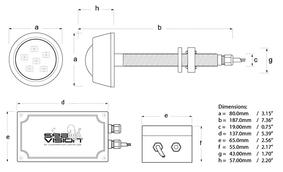 Lens Material Housing Material Light Source Light Output Operating Voltage Power Consumption Degree of Protection Weight Installation type Cable Recommended Positioning Suitable hull materials Approvals Manufactured in Outline |